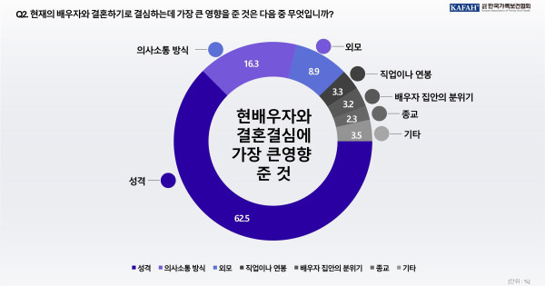 전체 응답자 중 62.5%가 ‘배우자의 성격’을 결혼 결정의 주요 요인으로 꼽았다. 이어 ‘의사소통 방식(16.3%’), ‘외모(8.9%)’, ‘직업·연봉(3.3%)’, ‘배우자 집안의 분위기(3.2%)’, ‘종교(2.3%)’ 등이 뒤를 이었다. 이는 신혼부부들이 내적 요인을 외적 조건보다 더 중시하고 있다는 점을 보여준다.