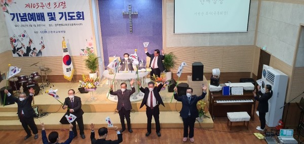 한국교회연합(대표회장 송태섭 목사)이 1일 오전 11시 강원도 원주시 벧엘교회(조성훈 목사 시무)에서 3.1만세운동 103주년 기념예배 및 기도회를 열고 자유·평화·정의 3.1정신을 계승해 나라를 살리고 한국교회 예배를 회복하는 데 앞장설 것을 다짐했다.