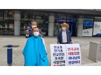 한국교회 연합기관 대통합을 촉구하며 28일 한국기독교연합회관 앞에서 삭발 후 금식가도에 돌입한 장성철 총무의 모습