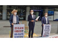장성철 총무가 28일 한국가독교연합회관 앞에서 한국교회 연합기관의 분열을 촉진시킨 교걔자도자들의 회개를 촉구하고 조속한 시일안에 대통합을 해야한다는 것을 골자로 한 성명서를 발표하고 있는 모습