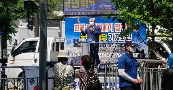 19일 청계 한빛 광장에서 국민혁명당 의장 전광훈 목사가 자유 대한민국을 바로세우기 위해 제3의 국민혁명이 일어나야 한다고 말했다.