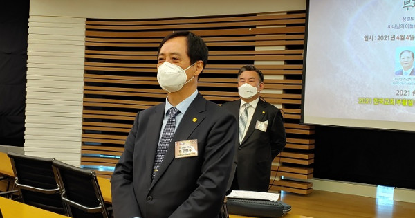 2021 한국교회 부활절연합예배에 대해 예배에 앞서 기자들에게 부리핑을 하고 있는 변창배 사무총장(통합).