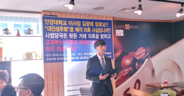 8768768976.jpg유현우 기자/안양대학교 신학대학 학생회(학생회장 왕현호)가 기독 사학을 대순진리회(이하 대진성주회)에 불법 매각한 것과 관련 “교육부와 정부당국은 특별 감사를 해 진상을 밝힐 것”을 골자로 한 성명서를 발표 했다.
