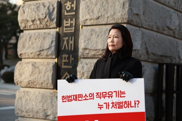 이진숙 전 방송통신위원장이 헌법재판소 앞에서 출근길 1인 시위를 하고 있다. 이 전 위원장은 헌법재판소에 헌법소원과 효력정지 가처분을 신청했지만 100일이 경과했음에도 헌재는 여전히 깜깜 무소식이다(사진=GMW연합)